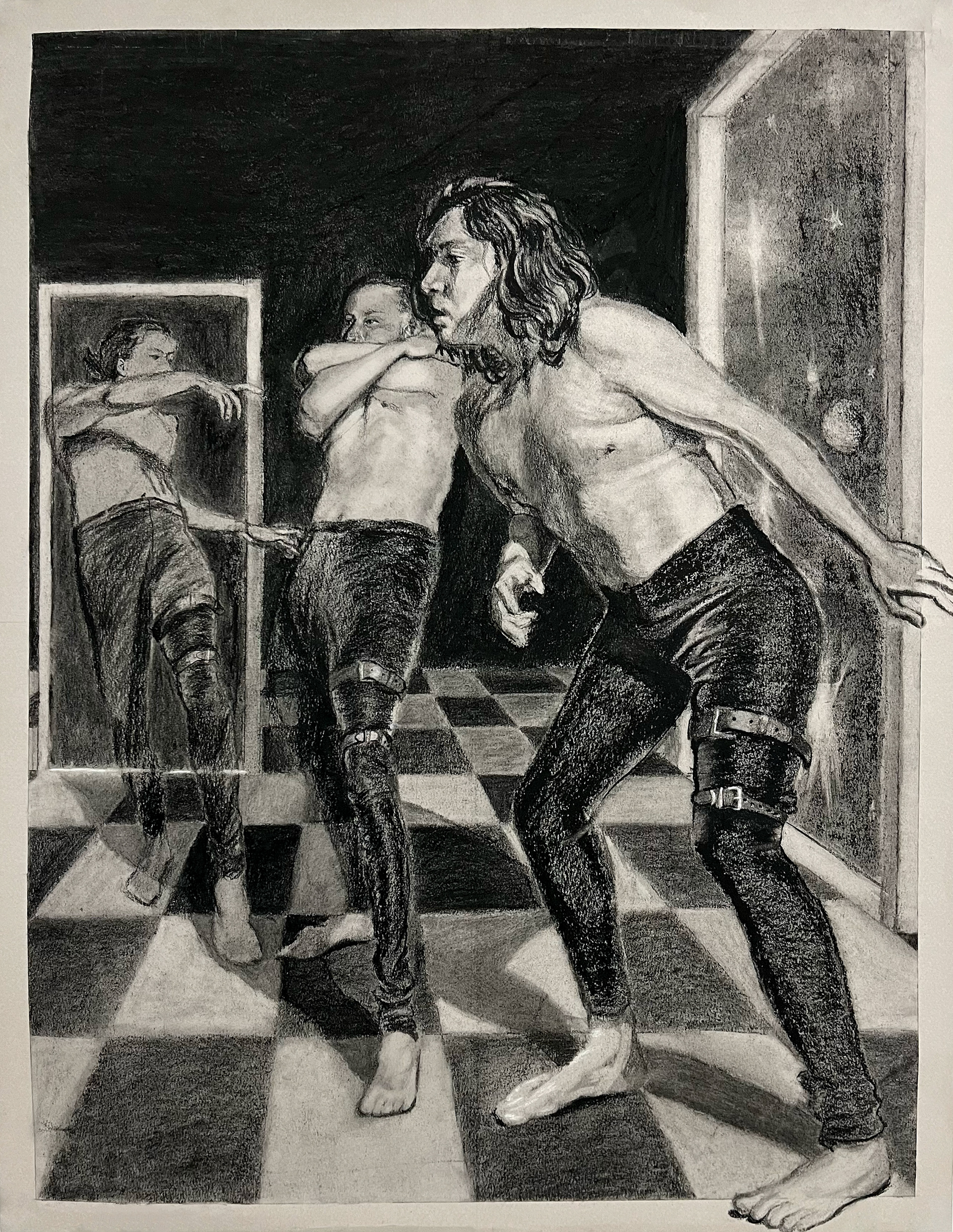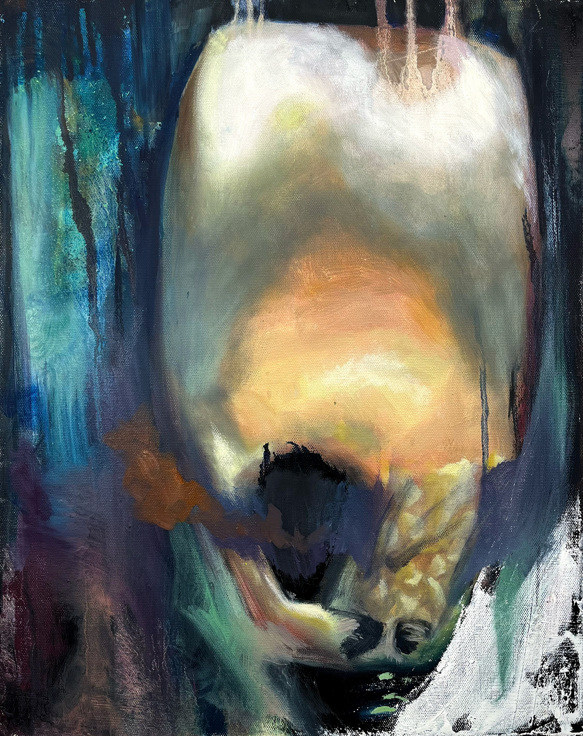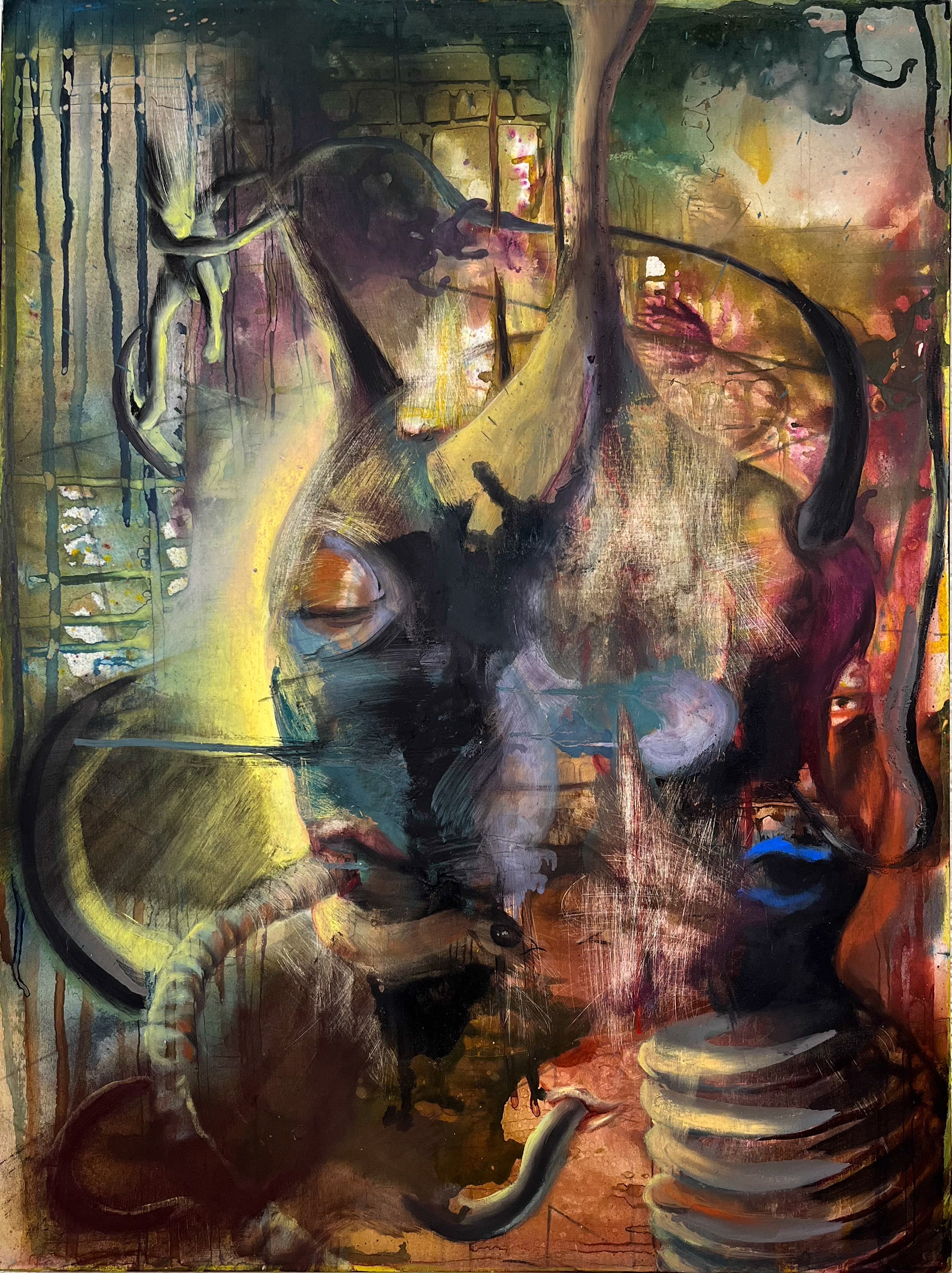 Acrylic ink, soft pastel, and oil paint on wood panel