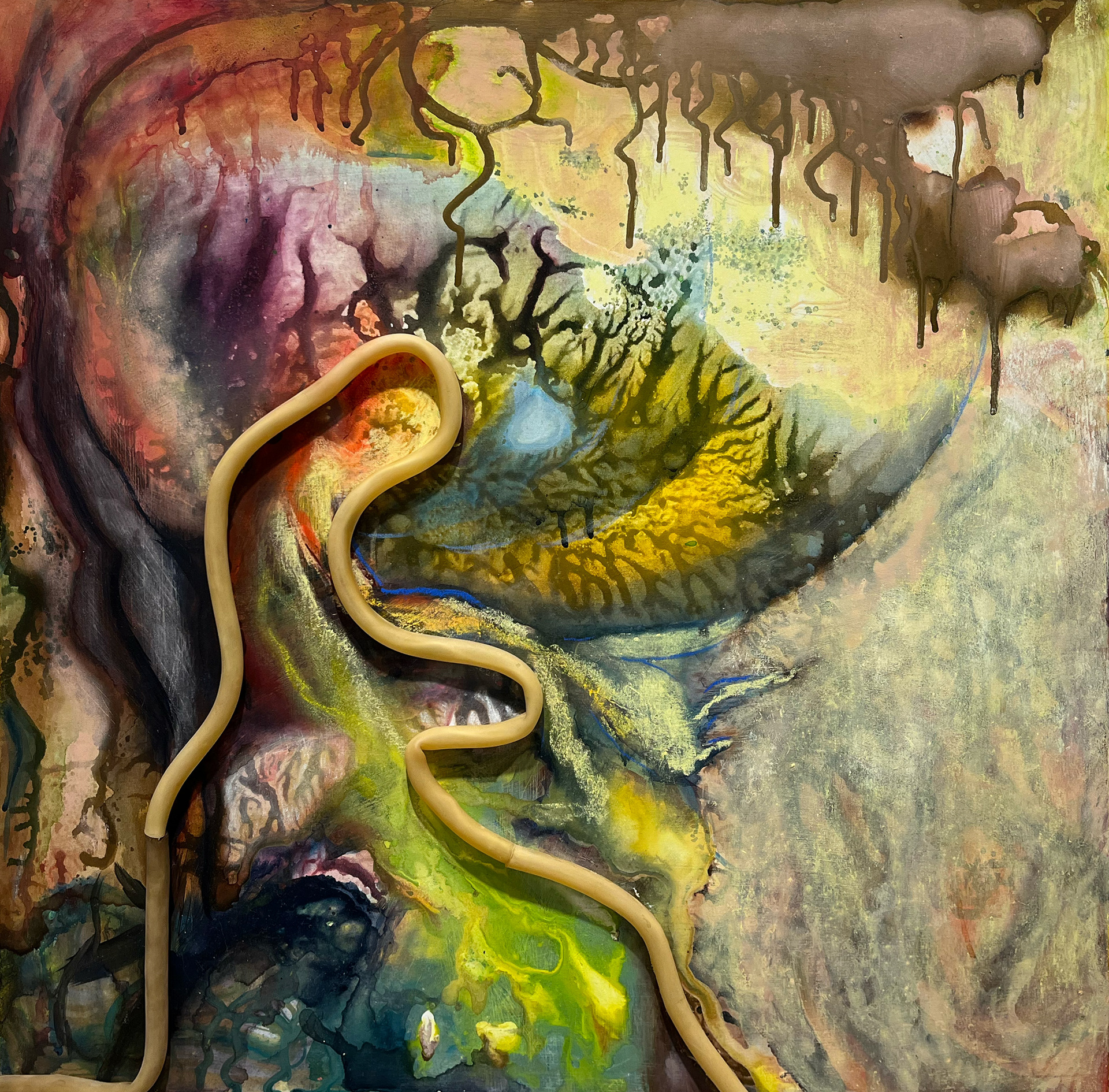 Acrylic ink, soft pastel, and latex tubing on wood panel
