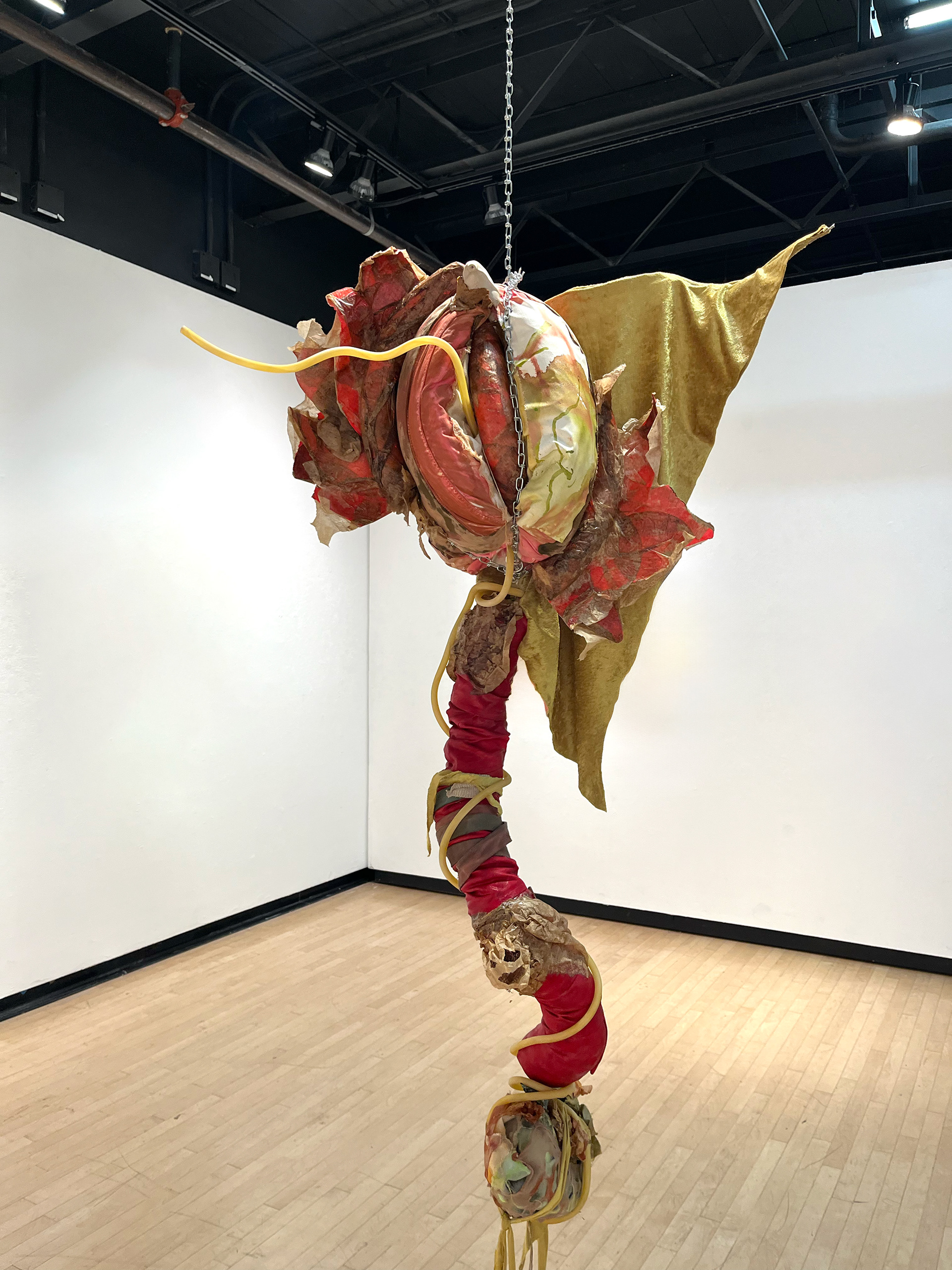 tubing, armature wire, cardboard, canvas pad sheet, acrylic paint, pillows, styrofoam