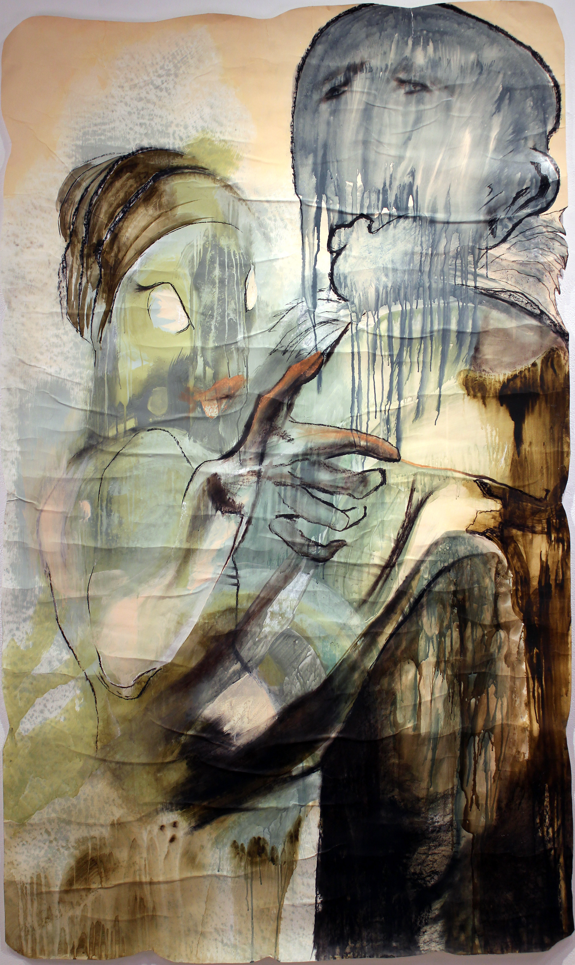 Acrylic ink, soft pastel, oil paint, used coffee filters, twine, canvas,