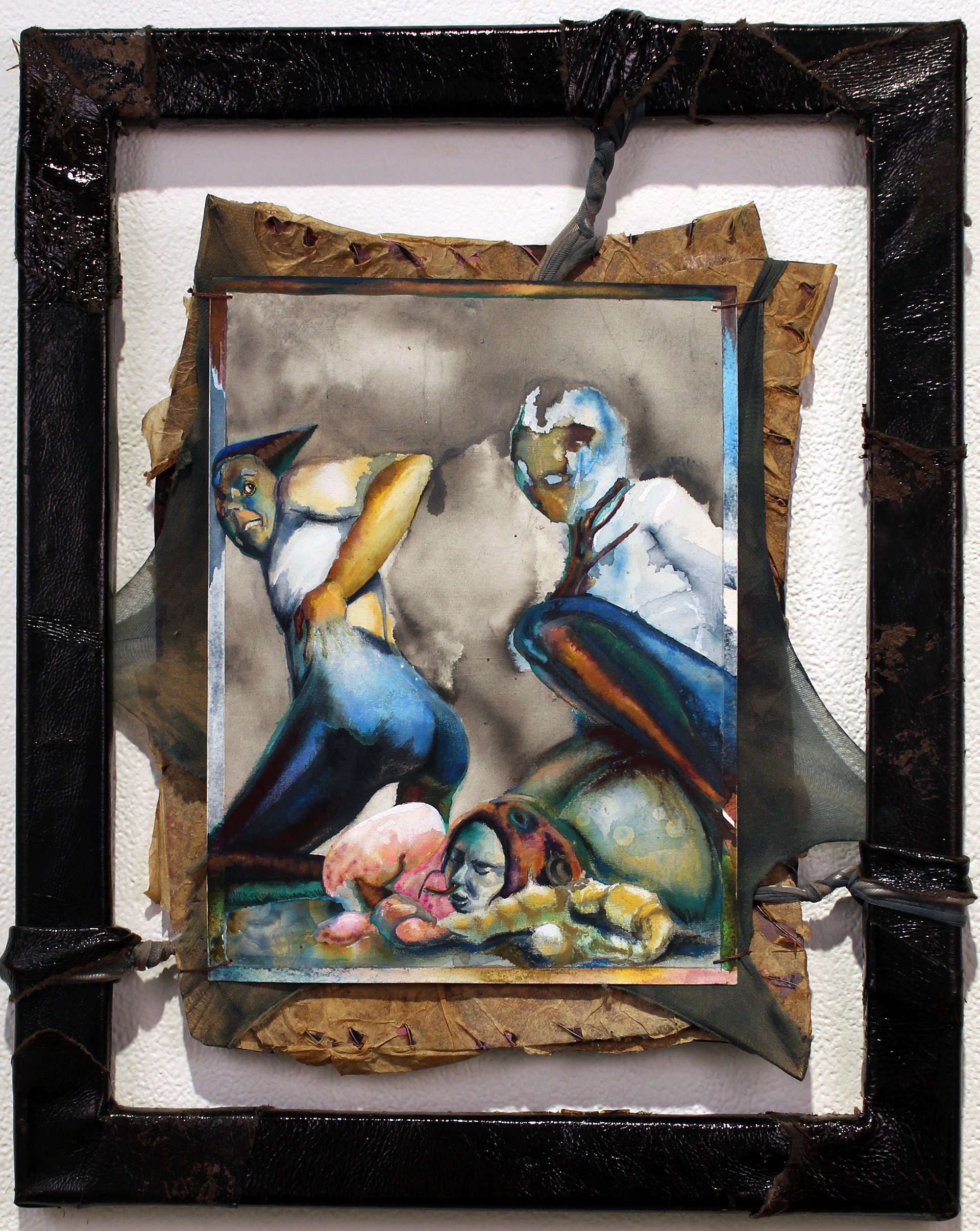 Acrylic ink, soft pastel, oil paint, used coffee filters, twine, canvas,